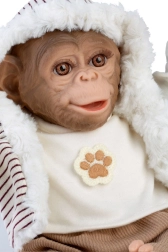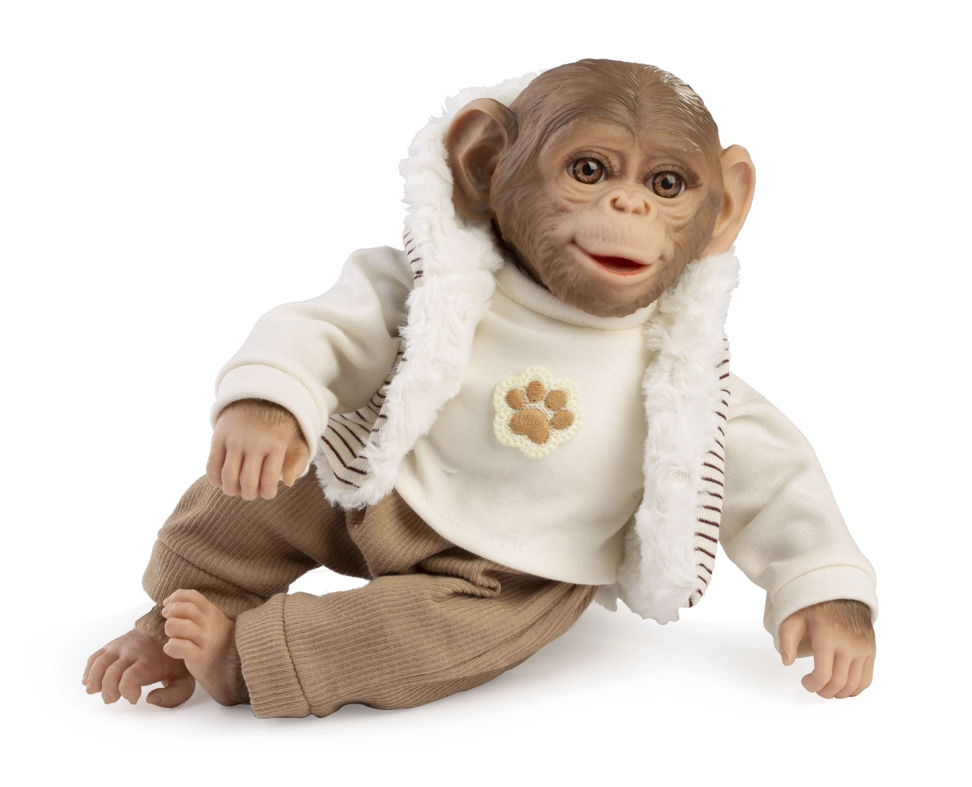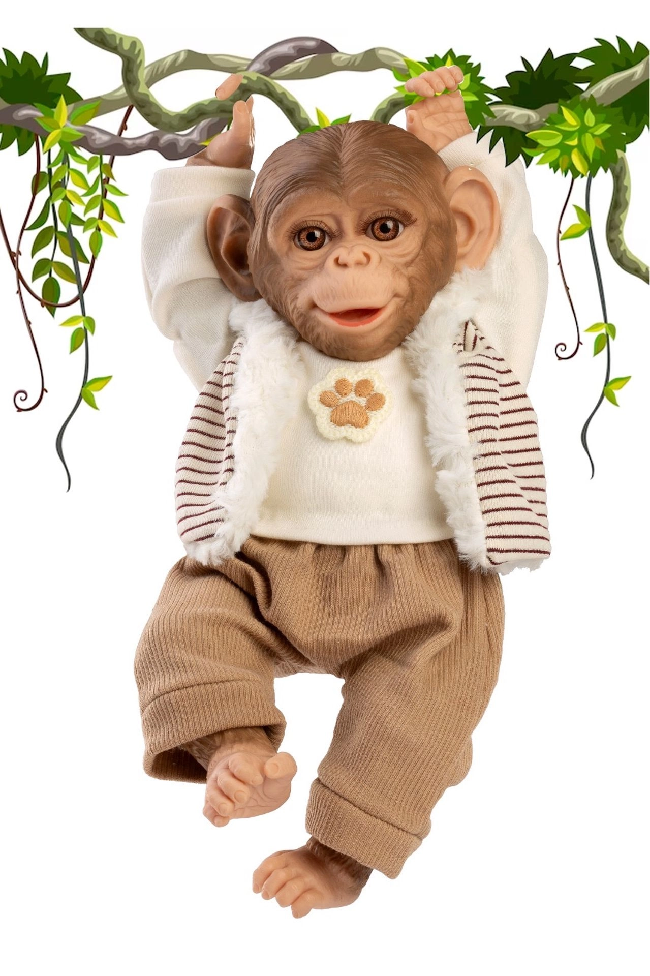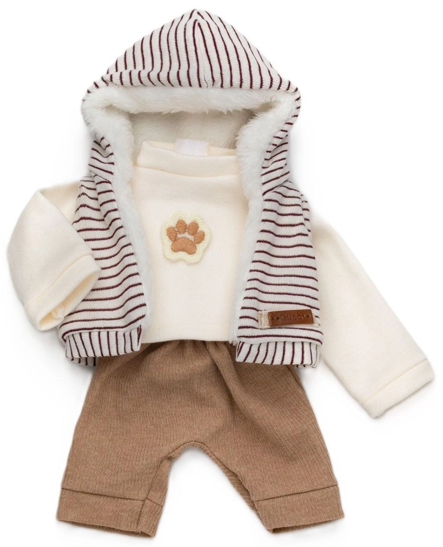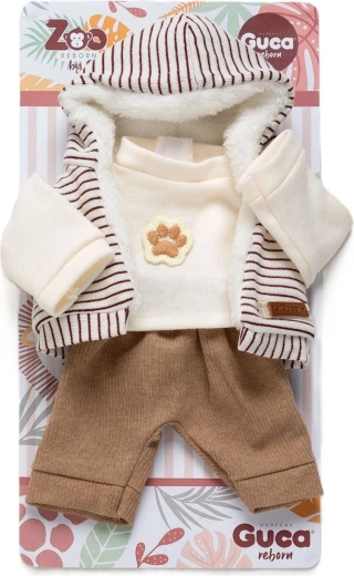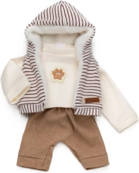 Este conjunto con estilo para monito Reborn de 32 cm incluye tres piezas coordinadas: camiseta de manga larga color crema con motivo de huella, chaleco a rayas con capucha y forro cálido tipo peluche, y pantalones cómodos. El outfit está diseñado para vestir y desvestir fácilmente, para que los niños puedan cambiar rápidamente el look de su juguete favorito.