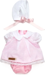 Este elegante set incluye un vestidito rosa con cuello blanco y encaje, braguitas a juego y un gorrito de punto blanco con lazo rosa. Los cuidados detalles, como el tejido finamente moteado, el ribete de encaje y los cortes cómodos, aportan a tu monito Reborn un aspecto auténtico y encantador.