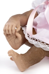 Vestido, braguitas tipo bloomer y gorrito de punto forman un conjunto armonioso que aporta encanto y comodidad al monito Reborn tanto para jugar como para exhibir.