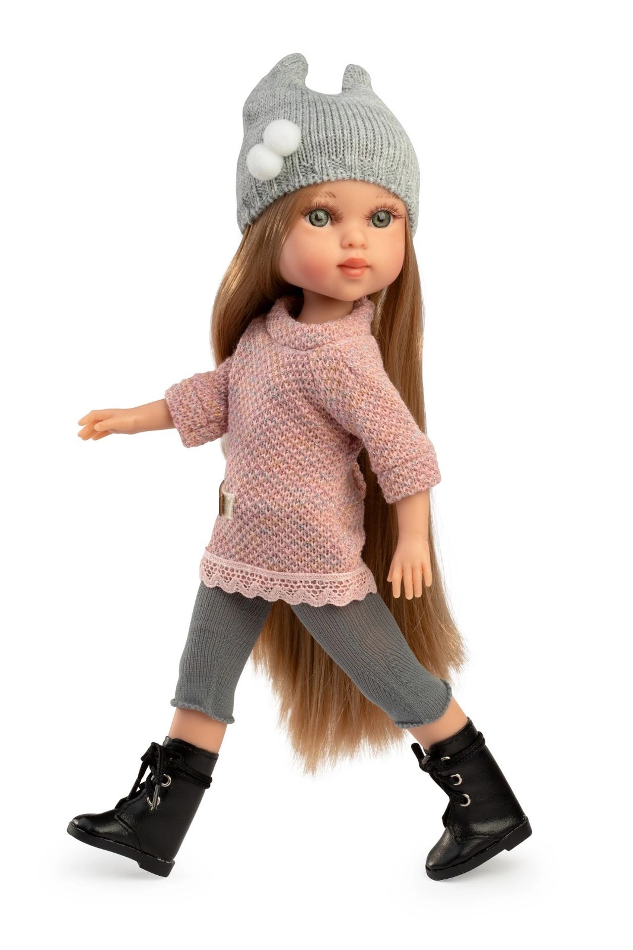 El set incluye una túnica, leggings, gorro con pompones y botitas negras con cordones, todo coordinado con un estilo moderno para muñecas de 34 cm.