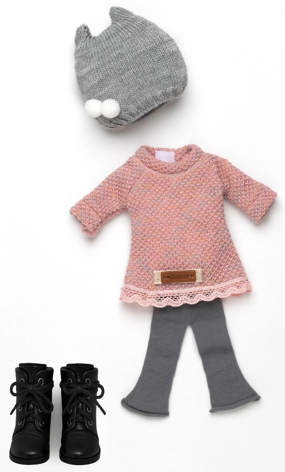 Regala a tu muñeca Penelope de 34 cm un nuevo vestuario. Este conjunto hecho a mano combina un suave aspecto de punto y comodidad: túnica rosa con detalles, leggings grises acampanados, gorro gris con dos pompones y botitas negras con cordones. El conjunto se ajusta muy bien y, gracias a sus detalles bien pensados, impulsa el juego creativo y el styling.