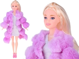 Muñeca con largo cabello rubio, vestido brillante y suave abrigo rosa/morado que añade elegancia y creatividad al juego.