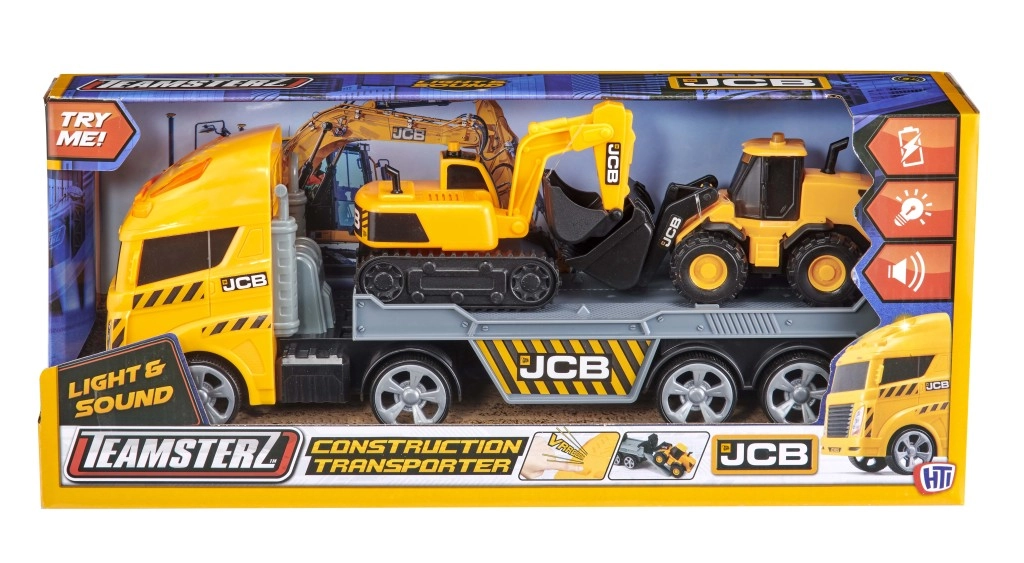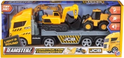 Set de transporte JCB ofrece a los niños una experiencia de obra realista: transportador amarillo con luces intermitentes y sonidos de motor, ruedas de libre movimiento y dos máquinas: excavadora y cargadora de ruedas con cucharas delanteras de manejo manual para un juego creativo y el desarrollo de la motricidad fina.