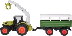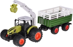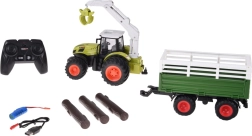 Este detallado tractor RC en un icónico color verde destaca por sus grandes neumáticos con dibujo profundo para mejor agarre y un robusto remolque para transportar carga. El brazo, controlado manualmente, gira 360°, puede elevarse y bajarse y la garra se abre y cierra manualmente, ideal para cargar los troncos incluidos.