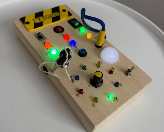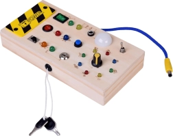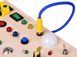 - 1× tablero manipulativo de madera con LED, 1× destornillador para abrir el compartimento de las pilas
