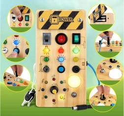 Este tablero Montessori activo de madera combina aprendizaje práctico y juego sensorial. Los niños conectan el cable, pulsan botones, cambian interruptores y observan cómo reaccionan los LED de colores, asimilando de forma natural la relación causa–efecto y entrenando la motricidad fina y la coordinación ojo–mano.