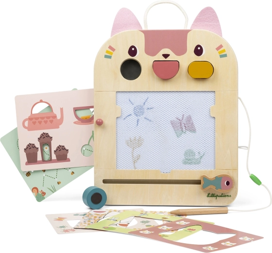 Descubre la pizarra mágica para dibujar gatita Jeanne de Lilliputiens, que ofrece a los niños desde 18 meses infinitas posibilidades de dibujo y juego. Incluye 3 sellos con formas, 6 tarjetas de actividades de doble cara y un lápiz de madera con cordón. Las imágenes se pueden borrar rápidamente y empezar de nuevo: ideal para desarrollar la motricidad fina y la percepción sensorial.