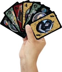 Disfruta del popular juego de cartas UNO con el oscuro y divertido estilo de Wednesday de la serie homónima. Esta edición incorpora una regla especial inspirada en la serie, gracias a la cual la partida es aún más emocionante. Una elección perfecta para los fanáticos de Wednesday y los amantes de los juegos de cartas familiares. Cuando te quede la última carta, no olvides gritar “¡UNO!”