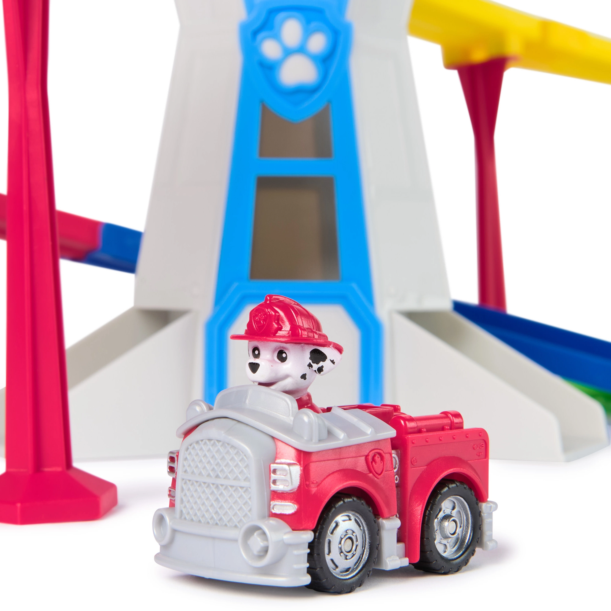 Este resistente y colorido set de juego, inspirado en el mundo de la PATRULLA CANINA, transporta a los niños a Adventure Bay. La torre, con detalles realistas y dos rampas anchas, permite lanzar los vehículos directamente a la acción: basta con colocar el cochecito en la parte superior y salir a la misión de rescate.