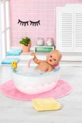 Regala a tu muñeca un relax total en la elegante bañera BABY born con diseño blanco y azul y la icónica onda. Los niños disfrutarán de auténticos juegos de agua gracias al cabezal de ducha funcional: cuando la bañera está llena, sale agua de verdad. Al pulsar el botón, además, se encienden efectos de luz de colores y suenan realistas chapoteos que intensifican la atmósfera del baño.