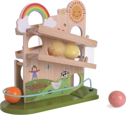 Esta creativa pista de canicas, con un fresco diseño campestre, convierte cada momento de juego en una colorida aventura. Los niños observan cómo las canicas avanzan por pistas con distintas inclinaciones, desaparecen en orificios y reaparecen, todo ello acompañado de divertidas ilustraciones del sol, el arcoíris y animales. La base estable y las piezas de madera suavemente acabadas garantizan una manipulación segura incluso para los más pequeños.