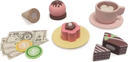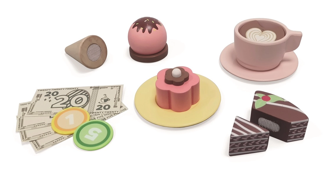 - 46 piezas para un juego variado: bebidas, postres, utensilios y dinero.
