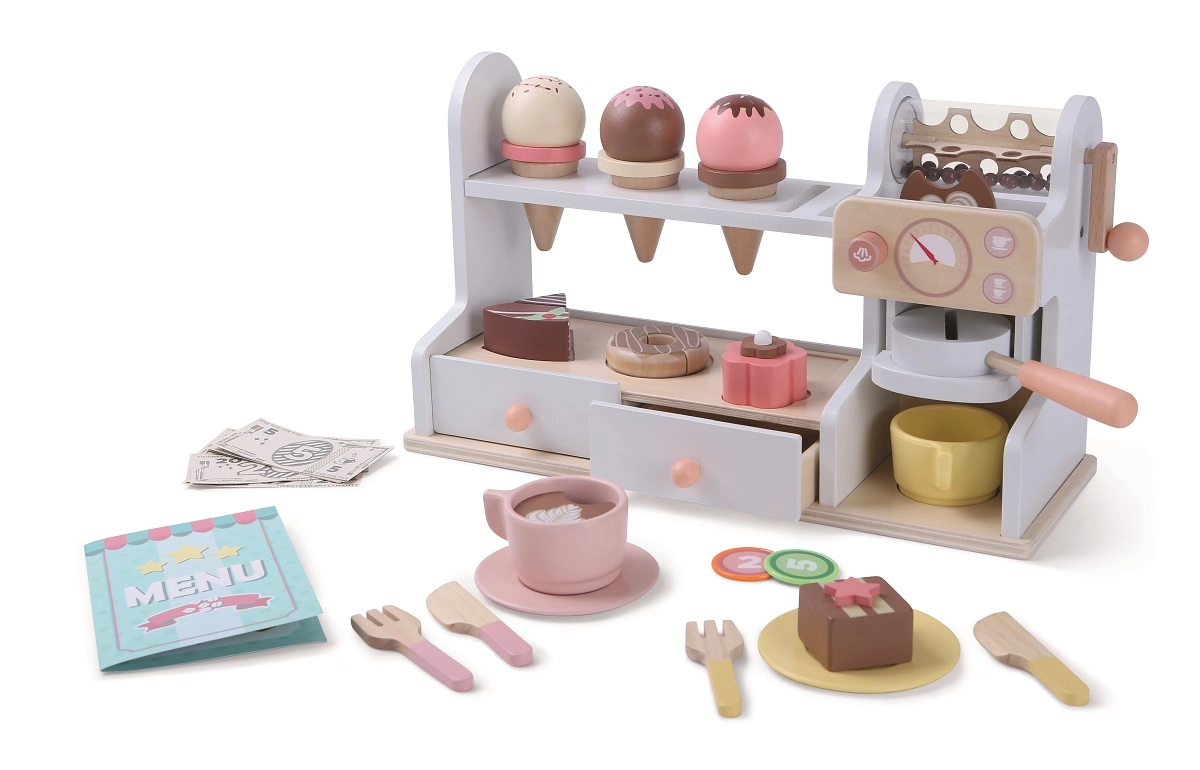 Abre tu propia confitería y cafetería con este juego de madera 2 en 1 de 46 piezas. Los niños disfrutarán de un juego realista de barista y dependiente gracias a la cafetera, la vitrina con pasteles, los soportes para helado, tazas con platillos, cubiertos y cajones para el dinero. Favorece la creatividad, la comunicación y el desarrollo del vocabulario.