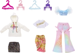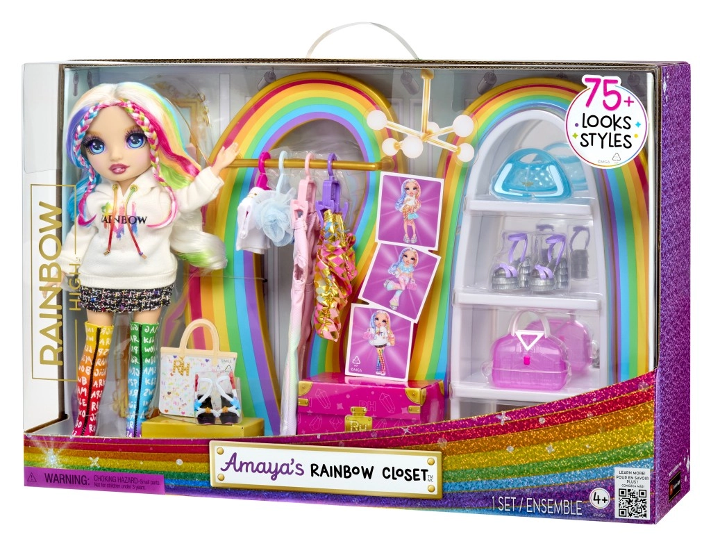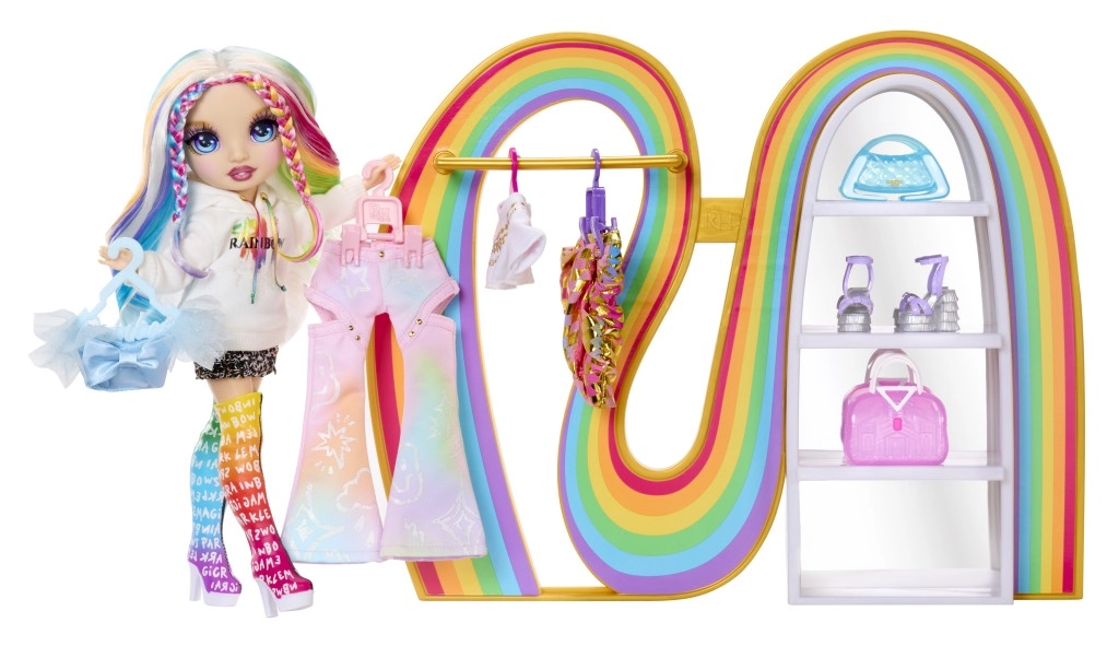 - 1 muñeca, armario/perchero arcoíris, 6 prendas de moda, 2 pares de zapatos, 2 bolsos, peine, perchero con 4 perchas, 4 estantes para zapatos