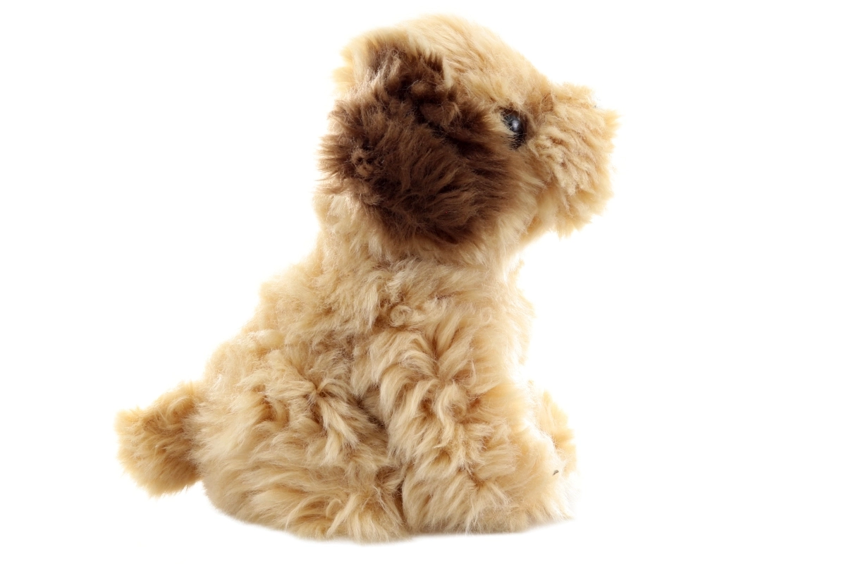 Orejitas más oscuras, hocico negro y postura sentada le dan un aspecto fiel al de un cachorro real.