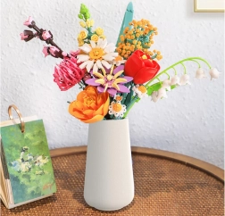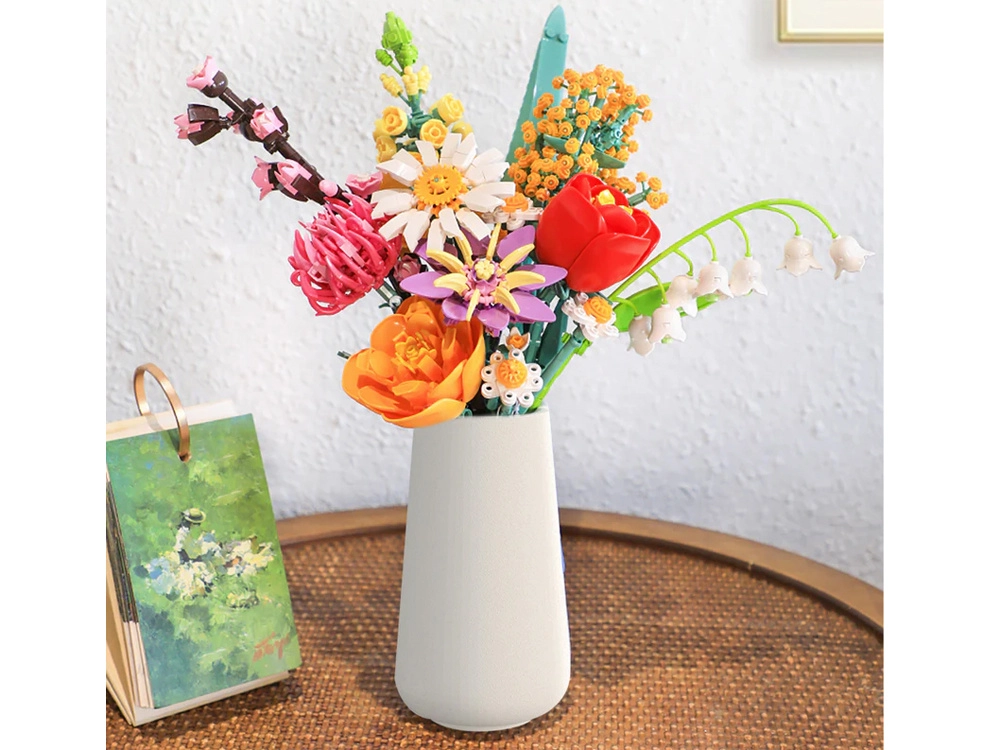 Este set de diseño combina el montaje creativo con la decoración moderna del hogar. En la caja encontrarás todo para montar un colorido ramo de flores, desde delicadas margaritas hasta llamativas crisantemos, todo ello acompañado de un jarrón de cerámica mate que aporta estabilidad y un aspecto limpio al arreglo.