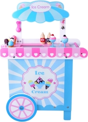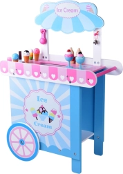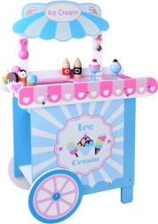Este elegante carrito de helados infantil en suaves tonos rosa y azul es ideal para jugar a la tienda o a la heladería. El mostrador superior sirve para exponer bolas, cucuruchos y polos; debajo encontrarás una gran balda y una “nevera” deslizante para guardar delicias y accesorios. Dos ganchos prácticos y una campanilla plateada completan una experiencia de servicio auténtica.