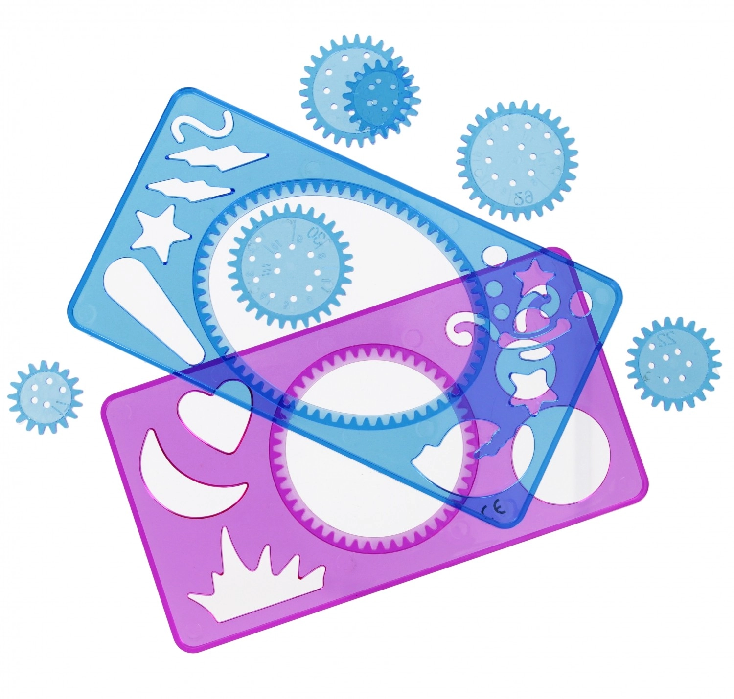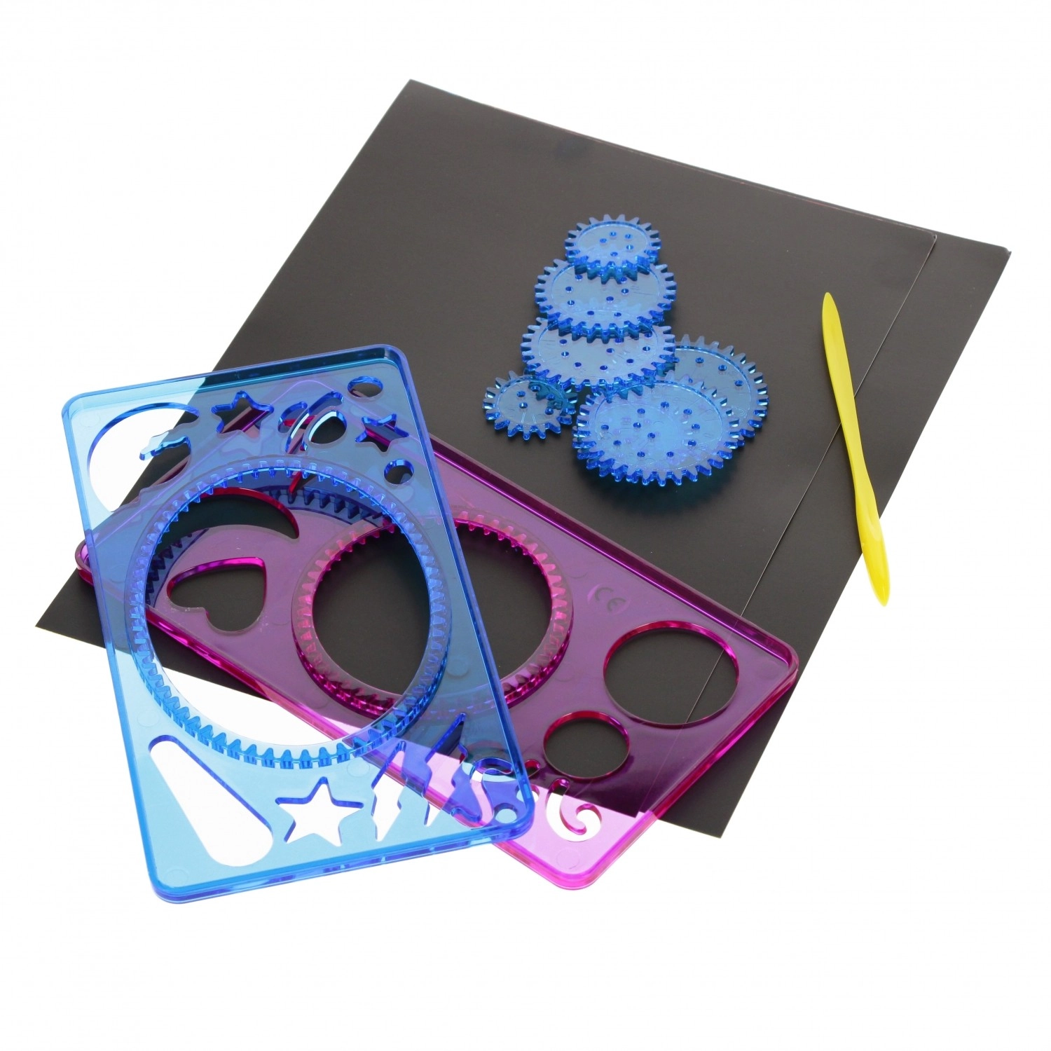 Dos placas rígidas y transparentes con anillos y formas dentadas permiten guiar las ruedecillas con precisión y trazar líneas limpias incluso en patrones complejos.