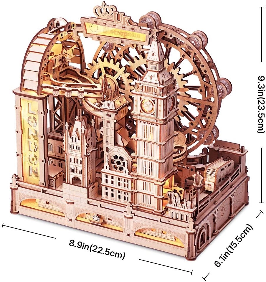 Descubre los monumentos icónicos de Londres en forma de un elegante rompecabezas 3D de madera. El modelo combina el Big Ben, el Tower Bridge y el London Eye con una pista de canicas dinámica, donde las bolas metálicas descienden por rampas y túneles gracias a la gravedad y a un potente motor. No faltan las simbólicas Joyas de la Corona, todo con énfasis en un acabado preciso.