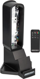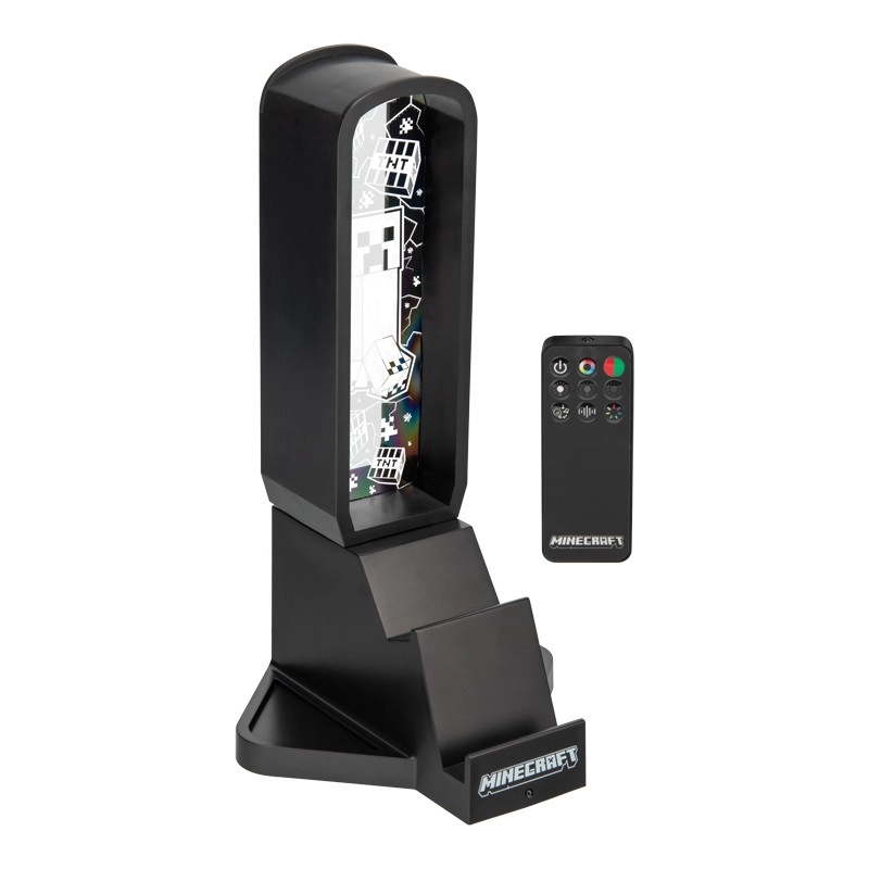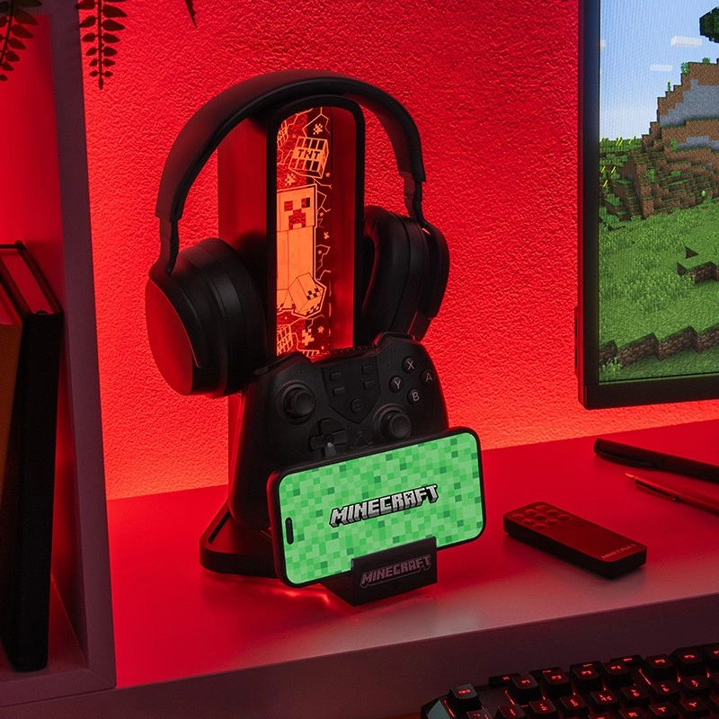 El elegante soporte para auriculares inspirado en el mundo de Minecraft destaca por su altura de 30 cm, sus modos de iluminación multicolor, un práctico soporte para teléfono y un par de puertos USB‑C para cargar accesorios. El control es cómodo gracias al mando a distancia y a la alimentación mediante cable USB, incluido en el paquete.