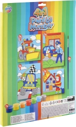 - 4 láminas de cartón preimpresas, set de pinturas acrílicas, pincel, instrucciones