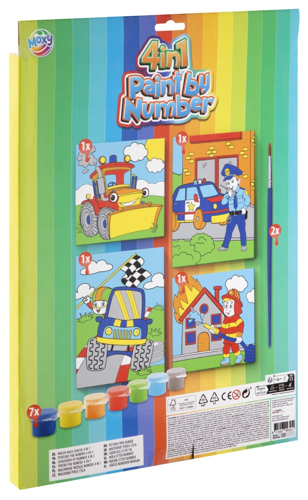 Descubre el divertido mundo de la creatividad con el set pintura por números 4 en 1 para chicos. El conjunto incluye 4 láminas preimpresas con motivos para niños, pinturas acrílicas, pincel e instrucciones. Cada número corresponde a un color, por lo que pintar es fácil y divertido y desarrolla la paciencia, la concentración y la motricidad fina.