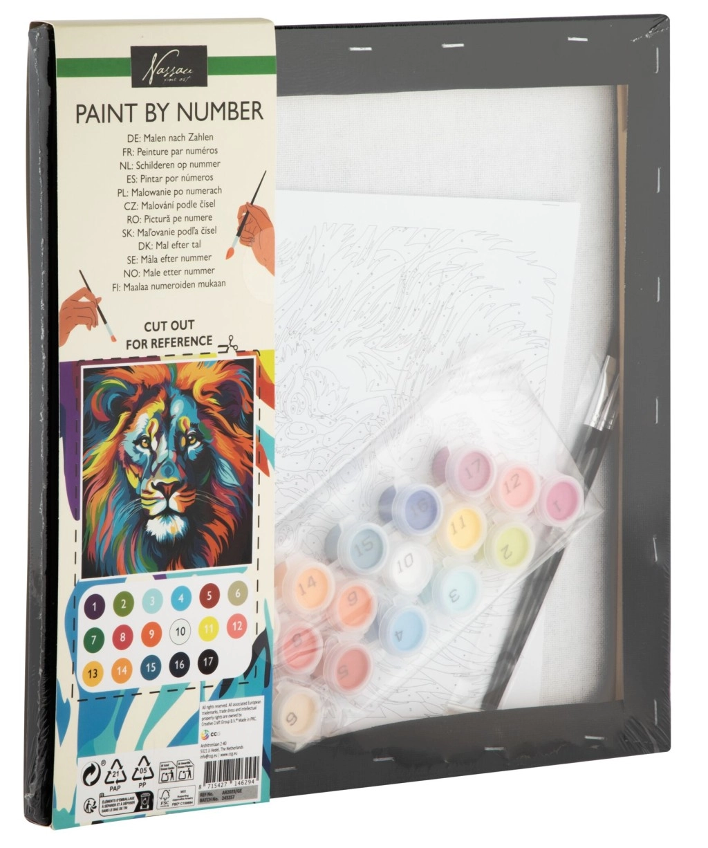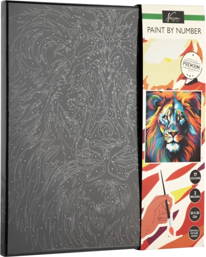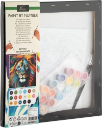Este set creativo con el majestuoso motivo de un león en lienzo negro es una opción ideal para niños y adultos que desean crear sin preparaciones complicadas. El contraste del fondo negro realza los colores y el resultado final luce como una auténtica obra de arte. Solo tienes que seguir los números y ver cómo el motivo se transforma paso a paso en un cuadro terminado.