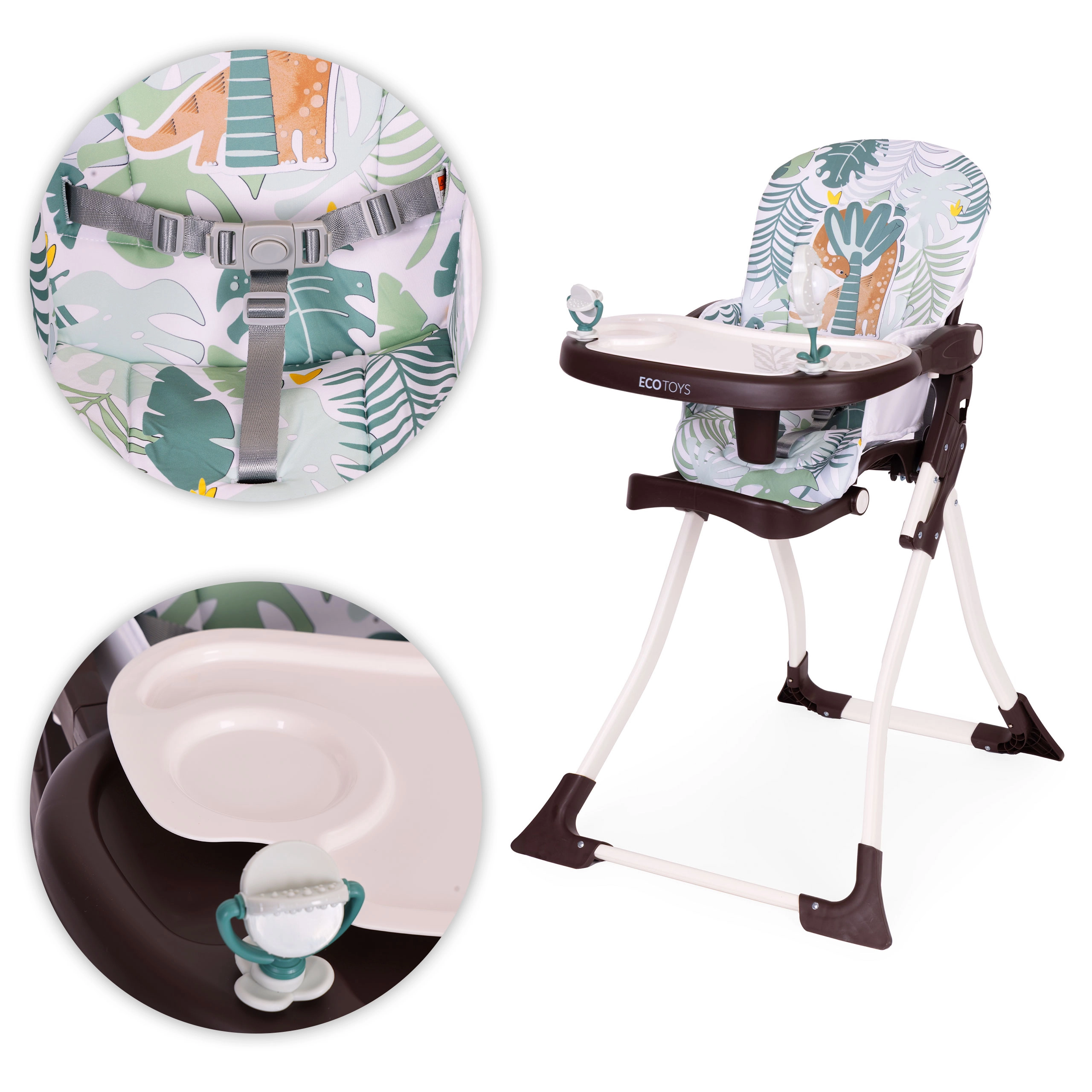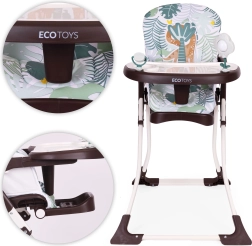La trona ECOTOYS facilita las comidas en familia y mantiene a tu pequeño cómodo y seguro. La amplia bandeja ofrece espacio suficiente para plato, vaso y juego; incluye una juguete giratorio y un sonajero que entretienen y estimulan los sentidos. Su estructura plegable ahorra espacio en interiores pequeños y facilita el transporte.
