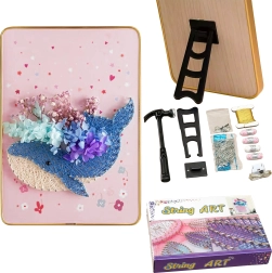 Crea tu propio arte de pared sin pintura: solo necesitas clavitos, hilos y una plantilla. El set te guía con un procedimiento sencillo: clava los clavitos en la base siguiendo el contorno y luego entrelaza el hilo. El resultado es un cuadro con volumen y un diseño original que destacará en cualquier interior.