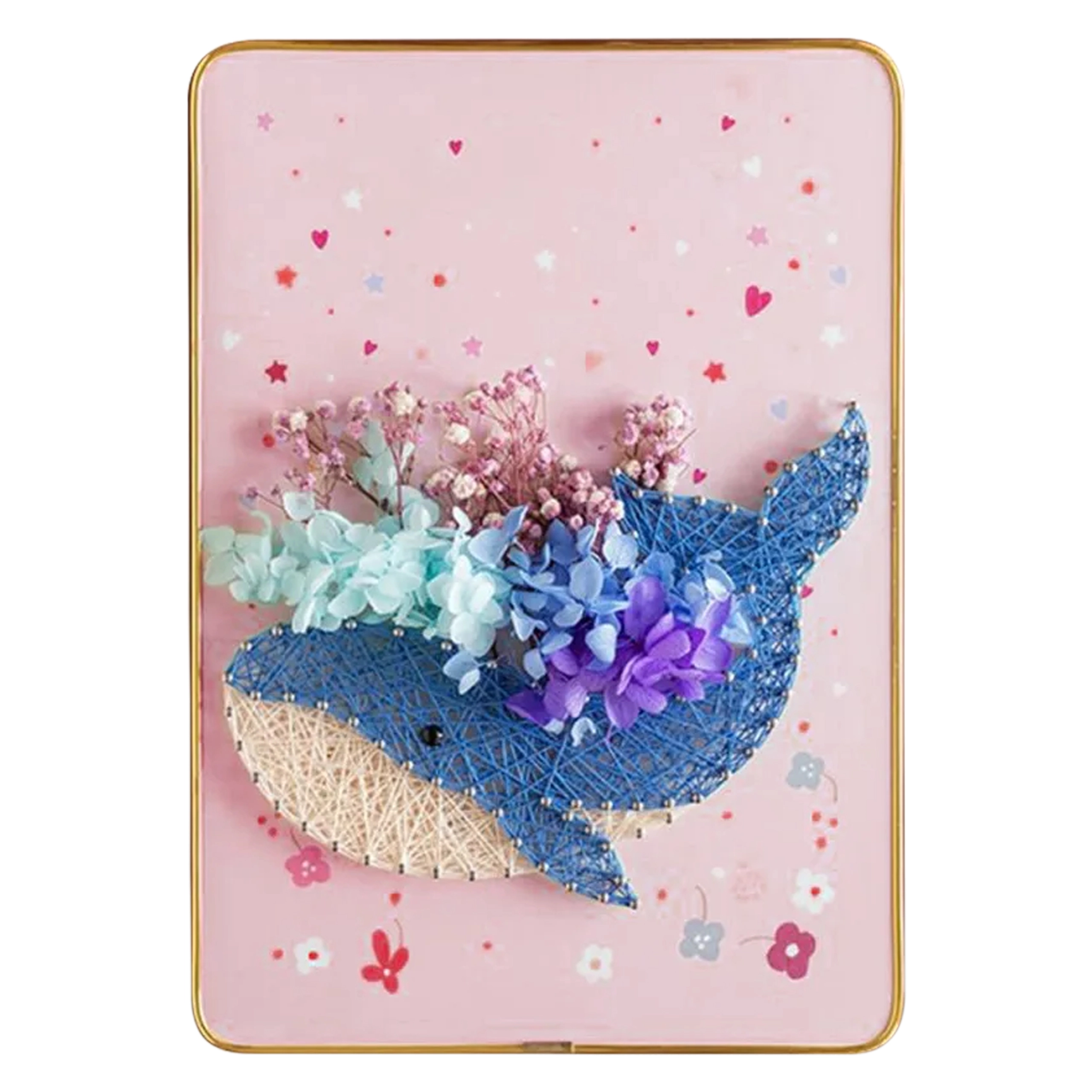 El set DIY completo incluye base enmarcada, clavitos, hilos y pequeñas herramientas. Empieza a crear nada más abrir la caja, sin buscar materiales adicionales.