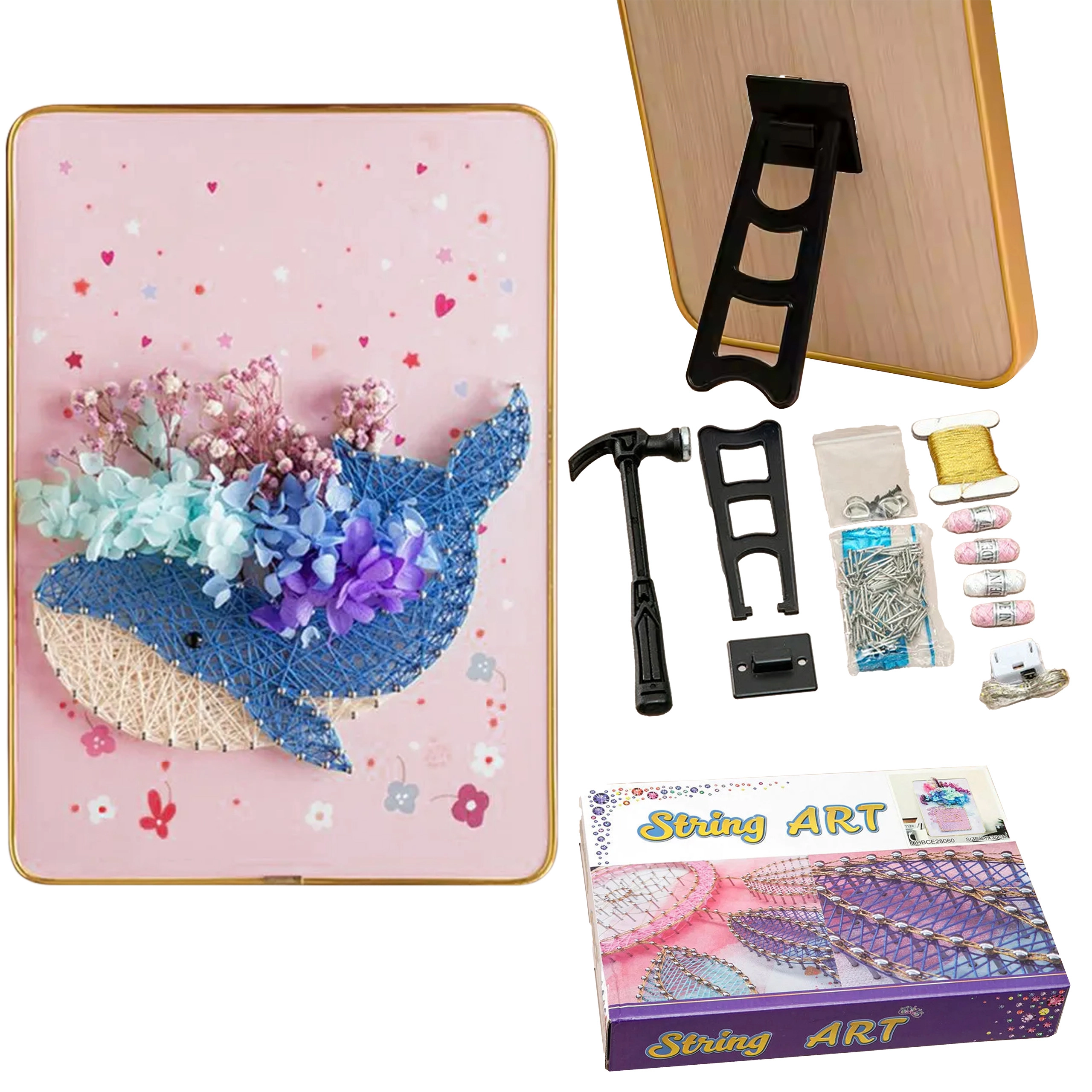 Descubre el divertido “arte con hilos” para niños y adultos. Este set creativo de string art incluye todo lo necesario para crear un cuadro decorativo en un marco de 21 × 30 cm con motivo de delfín. Gracias a las luces LED integradas, tu obra obtendrá una atmósfera mágica. Un regalo ideal que desarrolla la creatividad, la imaginación y la motricidad fina.
