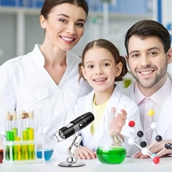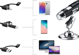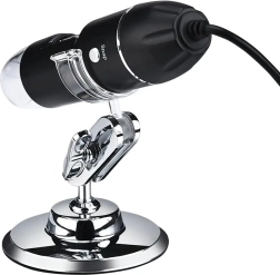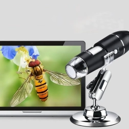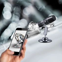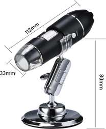 El manejo es intuitivo: el enfoque preciso se realiza con la rueda giratoria del cuerpo del microscopio, y el trípode proporciona una base estable para fotos y vídeos nítidos. A través de USB obtiene alimentación y conexión de datos, por lo que podrá capturar rápidamente fotografías y grabaciones para documentación o enseñanza.