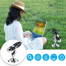 Descubra detalles que se escapan al ojo humano. Este microscopio digital USB con sensor de 2 MP ofrece una vista nítida en tiempo real y, gracias al aumento de hasta 1600×, revela estructuras de electrónica, minerales, textiles, plantas o insectos. Ocho LED de alta luminosidad con control de intensidad aseguran la iluminación adecuada de cada escena.