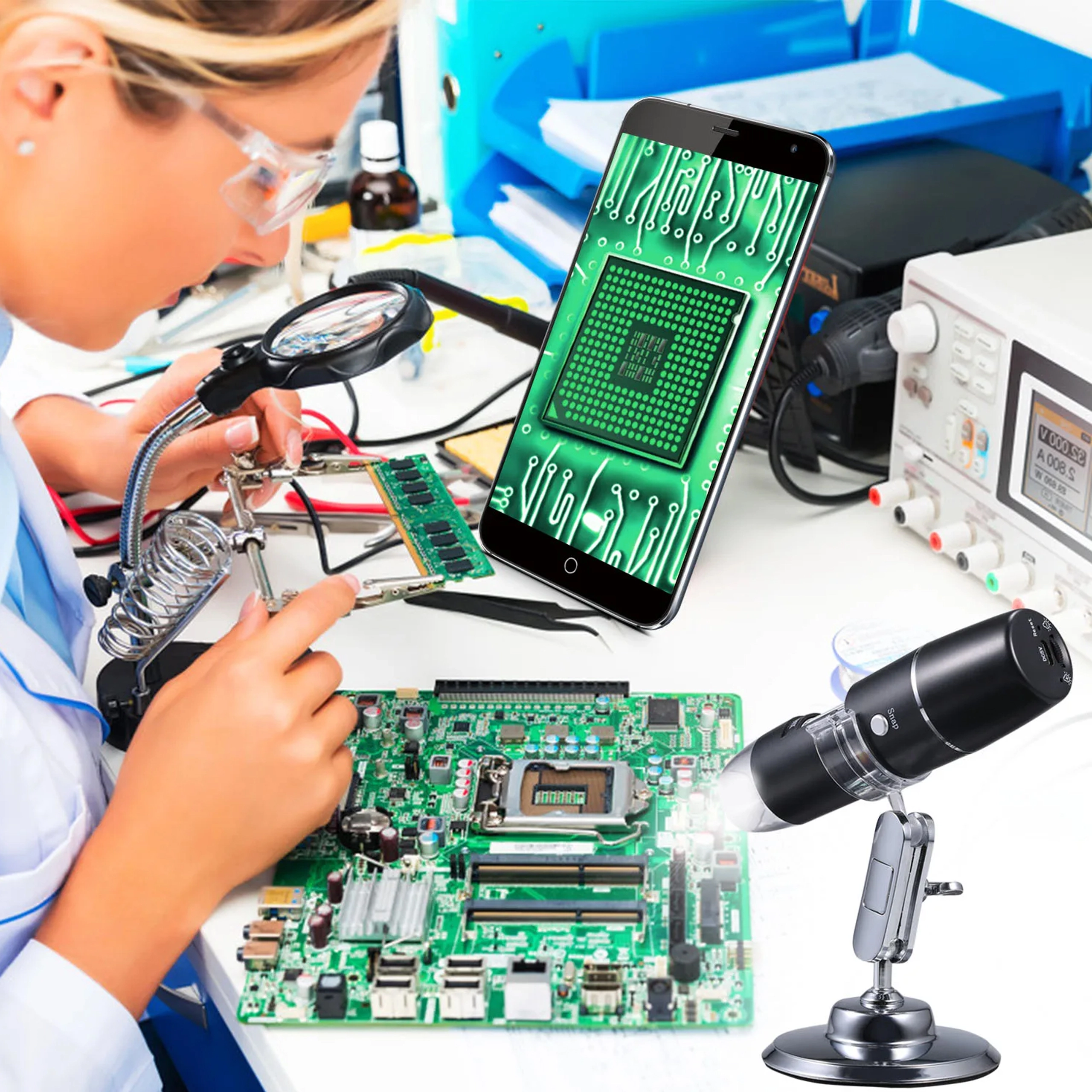 Explore microdetalles con alto aumento y un enfoque fino mediante el anillo giratorio. Ideal para electrónica, textiles y muestras biológicas.