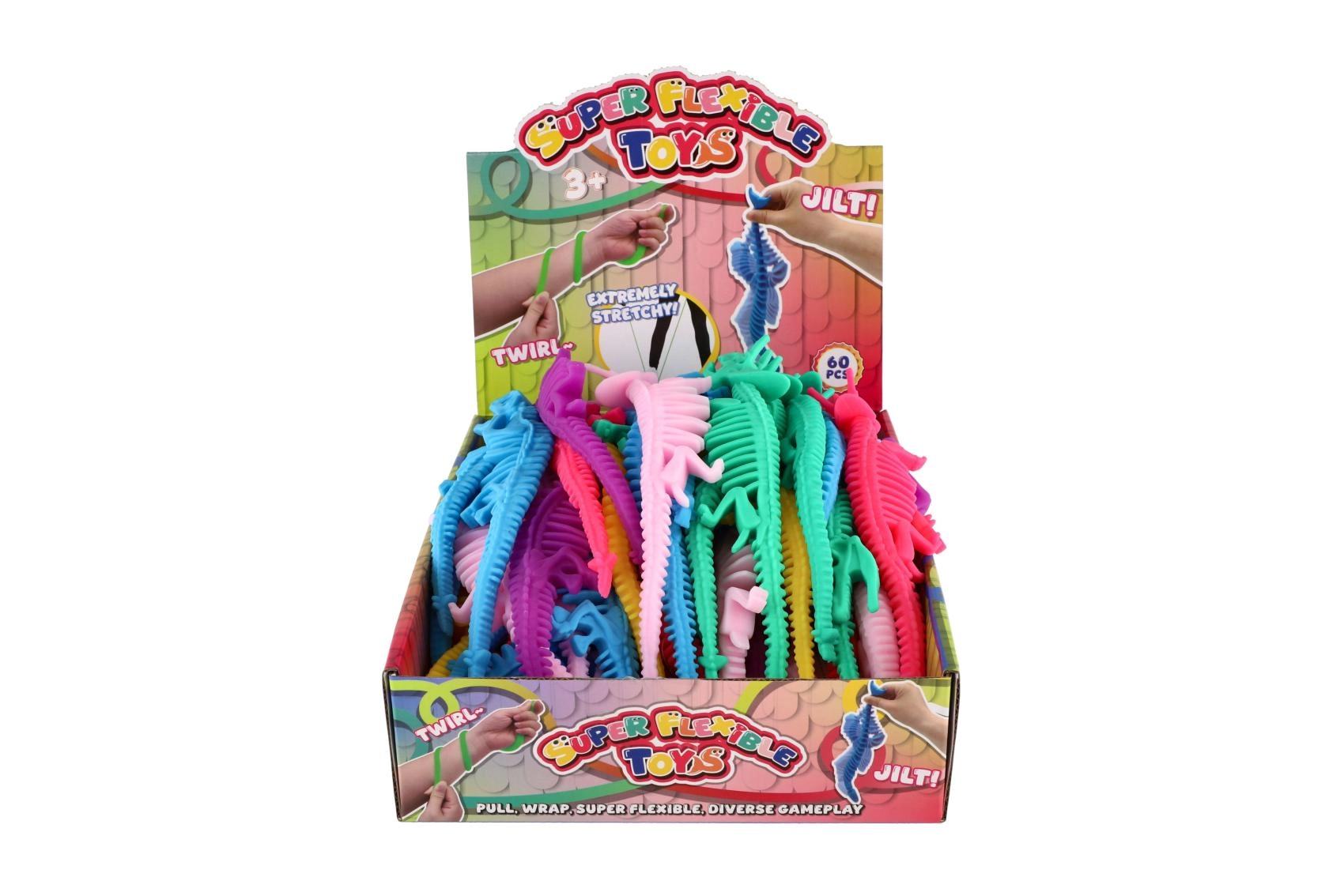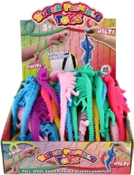Juguete antiestrés de colores con forma de esqueleto de dinosaurio hecho de silicona agradablemente suave, ideal para apretar, estirar y calmar el estrés. Longitud 22 cm, disponible en 6 colores llamativos, perfecto para niños y adultos como juguete fidget para liberar tensión.