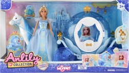 - Muñeca princesa, caballo, carruaje (carroza), corona, bolso, collar