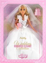 Sumérgete en un mundo de elegancia y romanticismo con la muñeca novia Lily. La bella novia, con falda de tul blanca, corpiño decorado y un delicado velo, destaca por sus detalles cuidadosamente elaborados. En su mano sostiene un bonito ramo de rosas y su larga melena clara invita a peinarla y estilizarla.