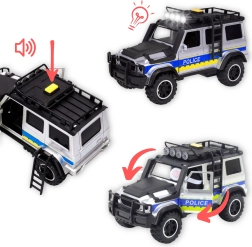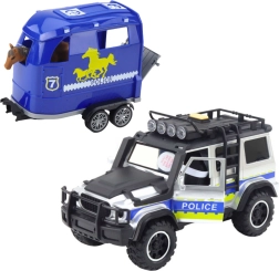 Sal a la acción con el coche policial todoterreno con remolque desmontable para caballos de la marca WOOPIE. Realistas efectos de luz y sonido, puertas abatibles y un acabado detallado en combinación de colores negro y azul garantizan un juego emocionante y creativo. También se incluyen pilas para empezar de inmediato.