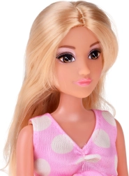 El vestido rosa con lunares de la mamá y el conjunto veraniego del papá con zapatillas fomentan el juego de cambiar de ropa y el estilismo de moda.