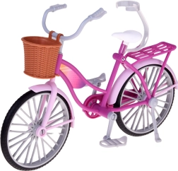 La bicicleta rosa‑lila con cesta delantera, portaequipajes trasero, pedales y ruedas de radios se mueve libremente y es fácil de manejar. El sillín con soporte mantiene a la muñeca estable durante el “paseo”.