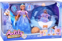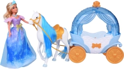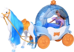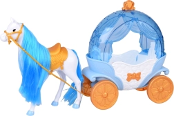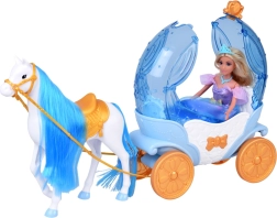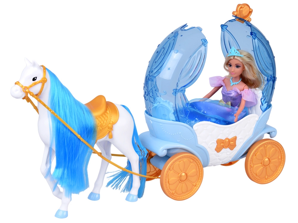 El carruaje “calabaza” en azul y blanco con acentos dorados tiene la parte superior abatible, para que puedas sentar fácilmente a la muñeca en su interior. El caballo blanco con crin azul está equipado con silla, brida y arnés, y el carruaje tiene ruedas móviles para un paseo suave por el suelo.