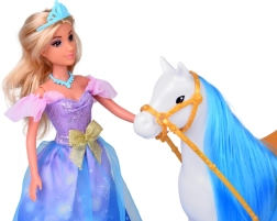 Esta elegante princesa con largo vestido en tonos azul, violeta y rosa con detalles brillantes y lazo dorado encanta a primera vista. Gracias a su largo cabello rubio, tiara y collar, los niños pueden disfrutar peinándola, vistiéndola e inventando sus propias escenas de cuento.