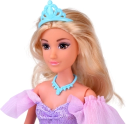 La muñeca tiene largo cabello rubio, tiara turquesa y collar. El vestido en tonos azul y violeta con lazo dorado y motivos de nieve aporta magia a cualquier baile.