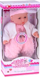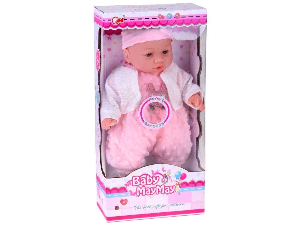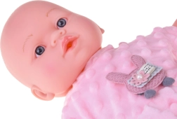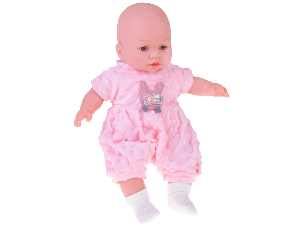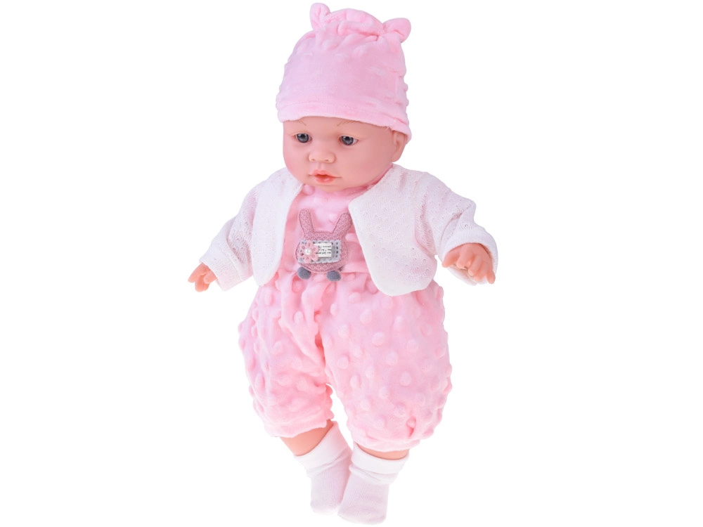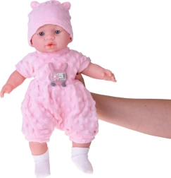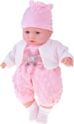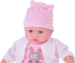 Un tierno bebé de 40 cm que encantará a cualquier niño desde los 12 meses. Gracias a su cuerpecito textil suave es perfecto para abrazar, ligero de llevar y con detalles faciales realistas. Al presionar la barriguita emite varios sonidos: balbucea, se ríe, solloza y gruñe. Incluye un suave ranita de minky rosa con aplique, gorro con orejitas, cárdigan blanco y calcetines.