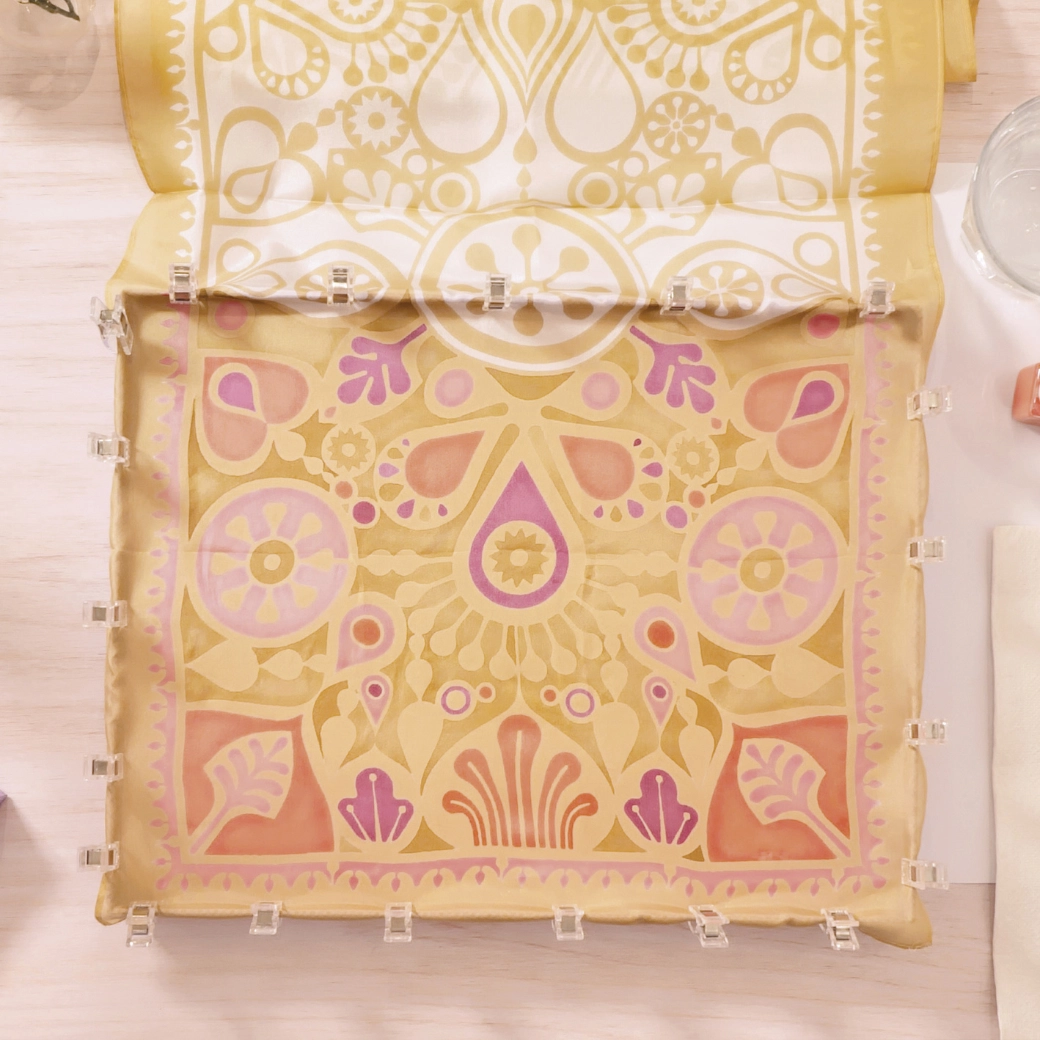- Pañuelo de seda, pinturas textiles, 2 pinceles, pinzas de sujeción, cuenco para pintura, plantilla/motivo