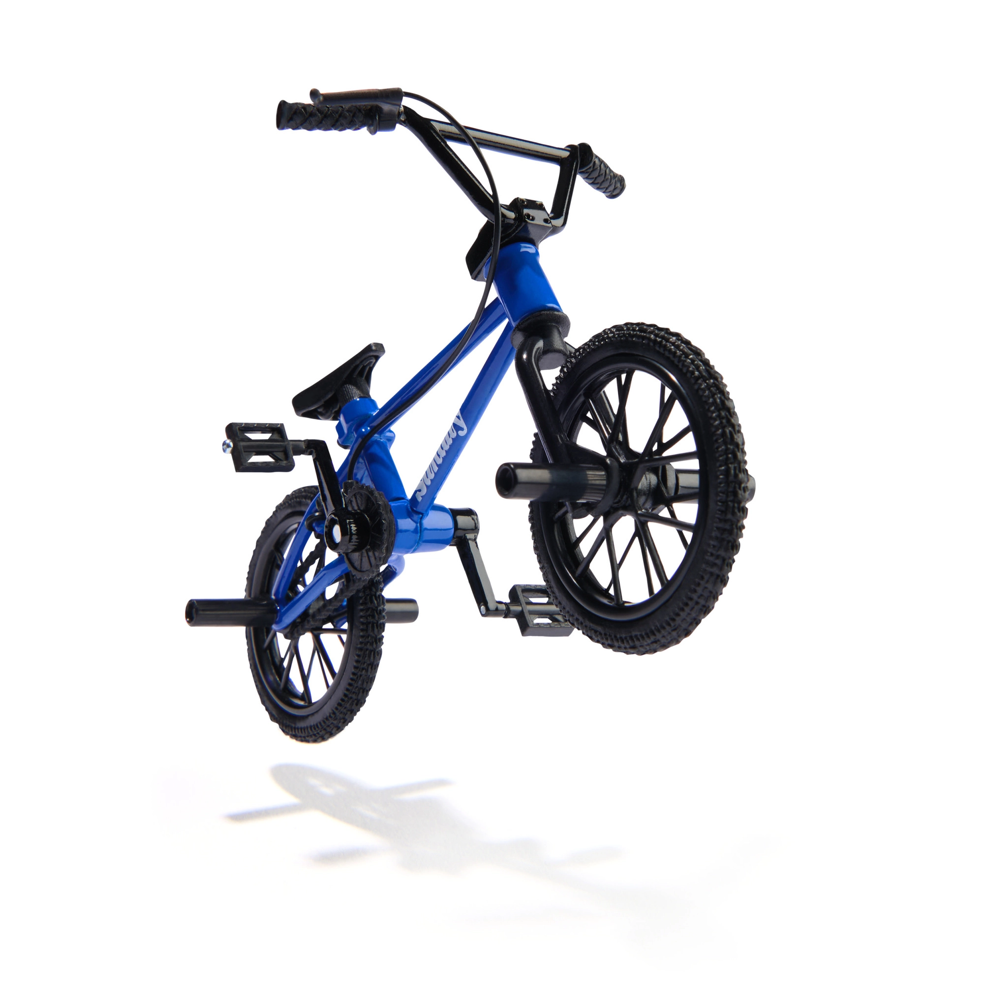 El finger BMX azul SUNDAY con cuadro, radios, pedales y pegs detallados permite entrenar trucos de freestyle directamente en la mesa.