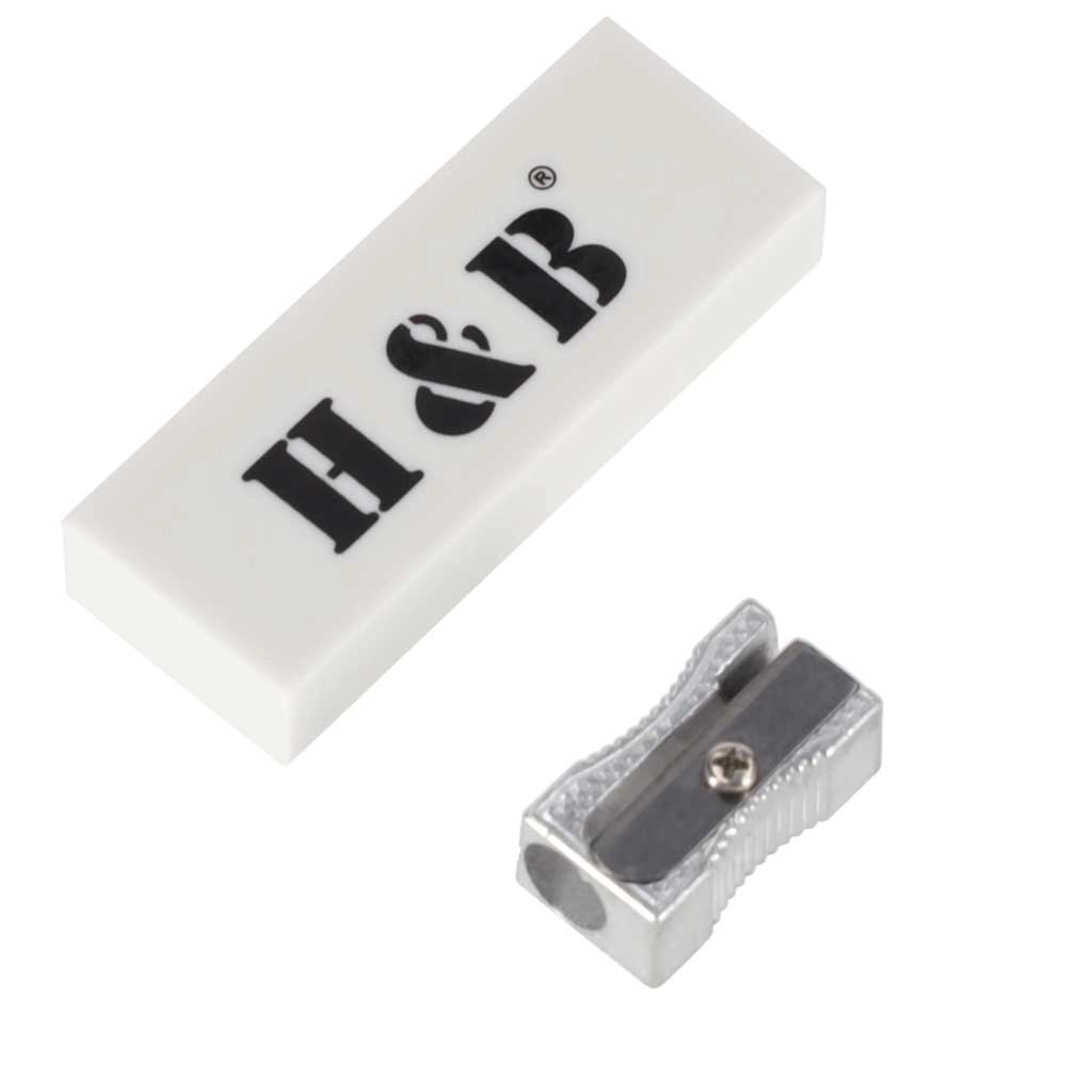 El set incluye una goma de calidad y un sacapuntas metálico, para que puedas dibujar, corregir y afilar en cualquier momento y lugar.