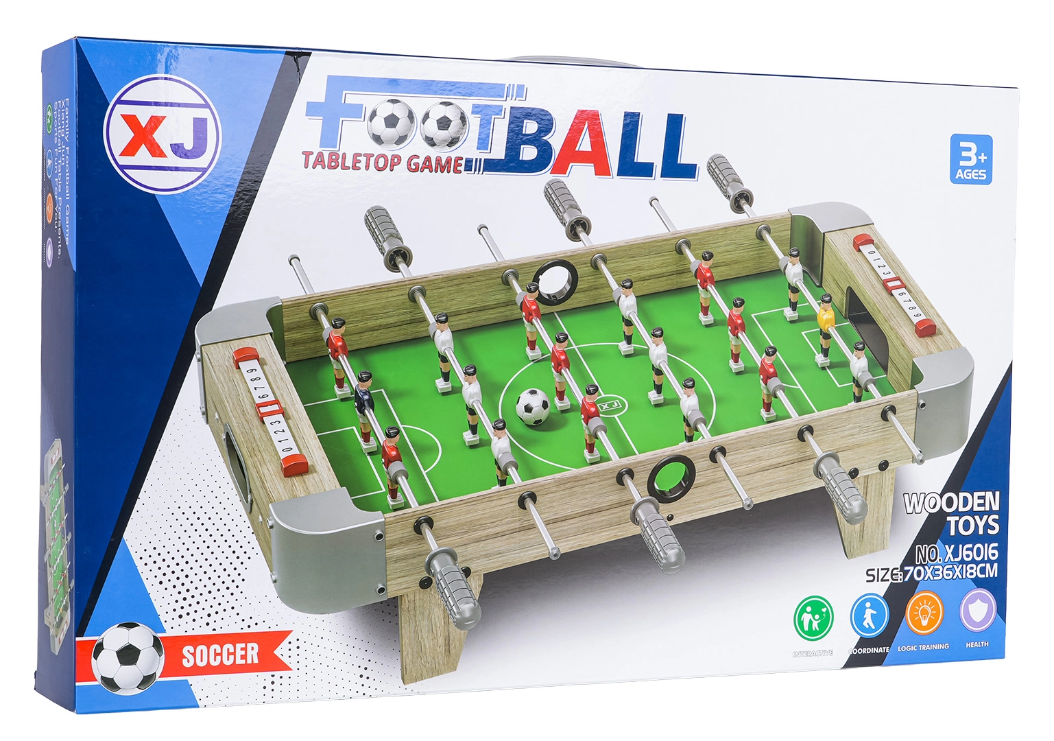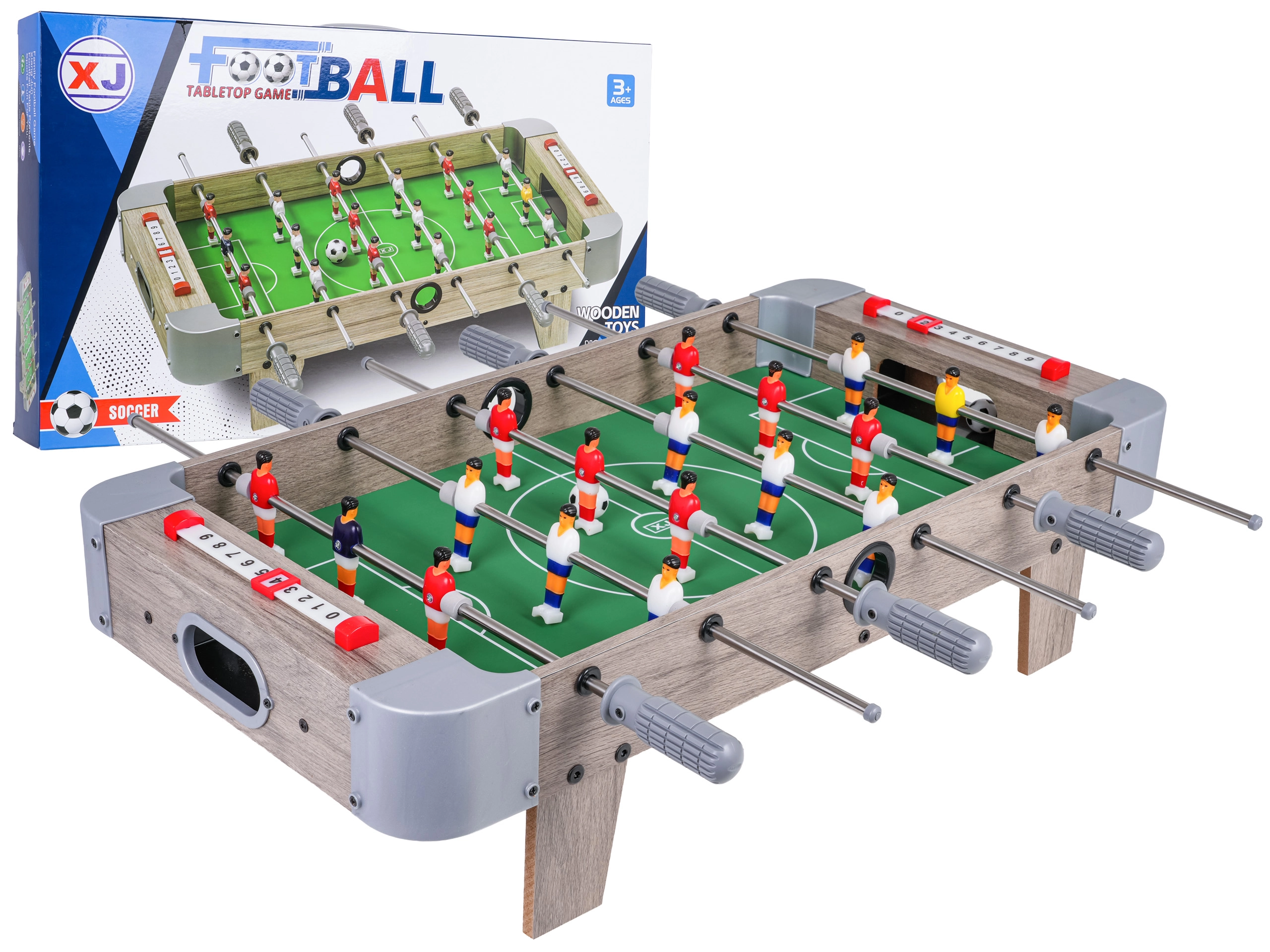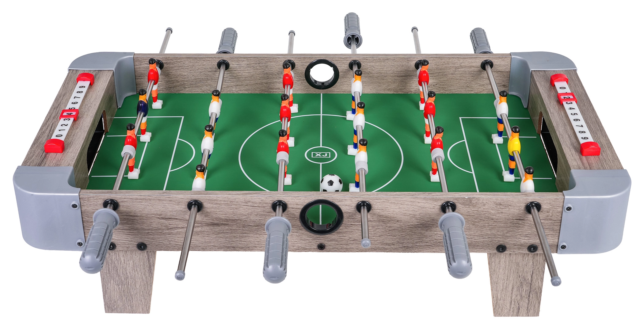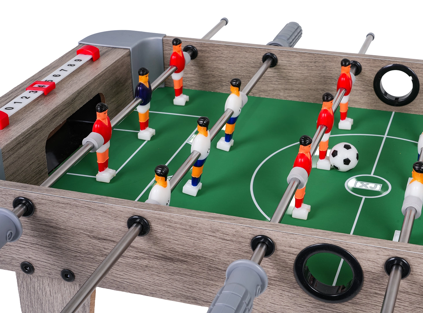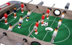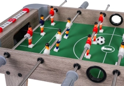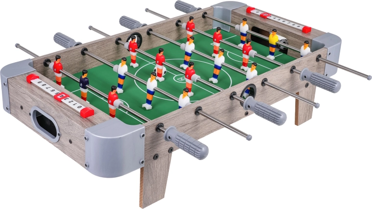 Este futbolín de mesa combina dimensiones compactas con una construcción resistente, por lo que cabe en cualquier mesa y puedes llevarlo a cualquier parte. El campo de juego verde con marcas claras, las figuras realistas y las barras metálicas de movimiento fluido garantizan un juego dinámico y justo.