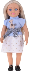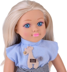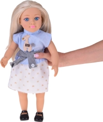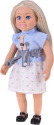 La muñeca viste una combinación elegante: top azul con rayas y aplique, cinturón chic y falda crema con motivos dorados, un conjunto armonioso completado con bailarinas negras. Gracias a los brazos, piernas y cabeza articulados, la muñeca puede sentarse fácilmente y colocarse en diferentes poses para escenas y narraciones.