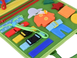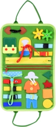 Cordones, cremalleras, hebillas, botones, formas con velcro, cocina, habitación infantil, jardín y calendario: una variada oferta de actividades para desarrollar la motricidad y la lógica.